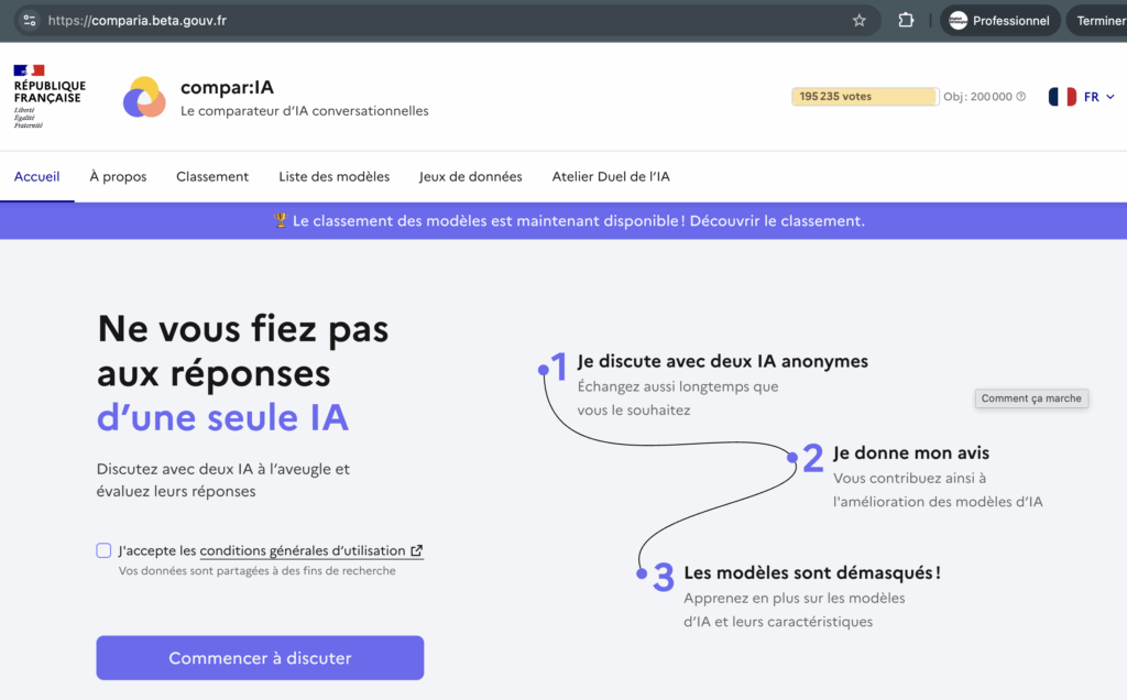 Si vous vous posez cette question, je vous invite à découvrir « compar:IA« , le comparateur d’IA conversationnelles créé par le Ministère de la Culture. Ce service innovant vous permet de tester et comparer les réponses de plusieurs intelligences artificielles en toute transparence, sans connaître leur identité. Après chaque échange, vous votez pour celle qui vous semble la plus pertinente ou utile : votre avis contribue directement à améliorer les modèles d’IA tout en soutenant la diversité linguistique et culturelle.